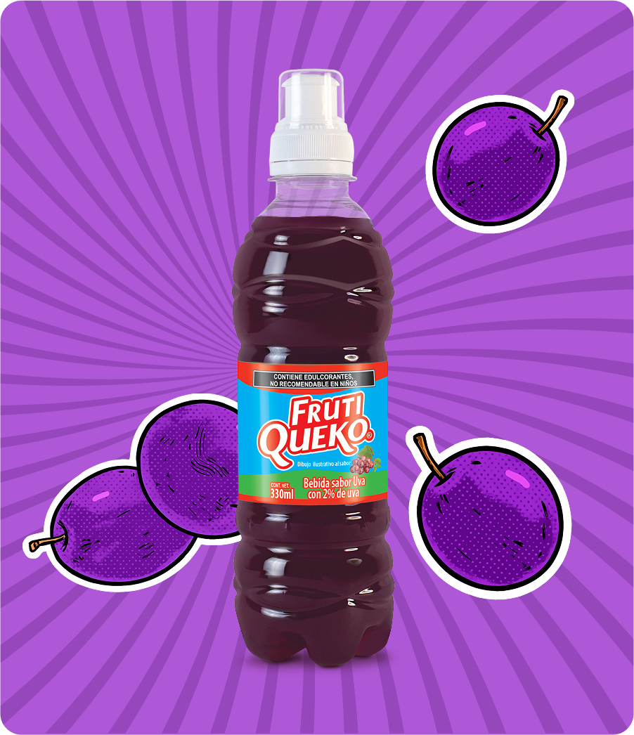 FrutiQueko Uva 330 ml es la bebida ideal para acompañar a niños y adolescentes en cualquier momento del día. Con solo 8 calorías y enriquecida con vitaminas A, B1, C y E, ofrece un sabor refrescante que equilibra lo divertido con lo saludable.